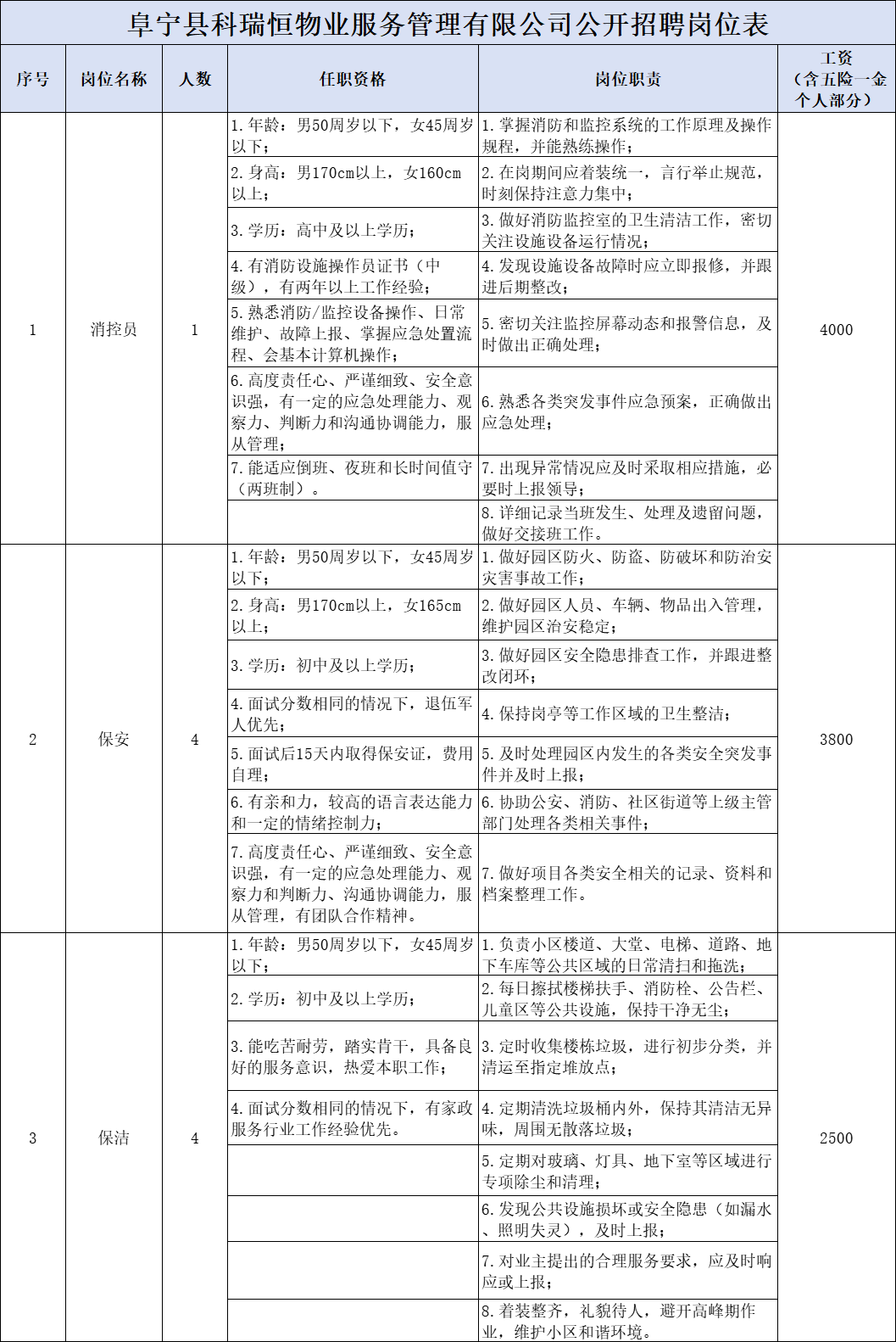 附件1:阜宁县科瑞恒物业服务管理有限公司公开招聘岗位表