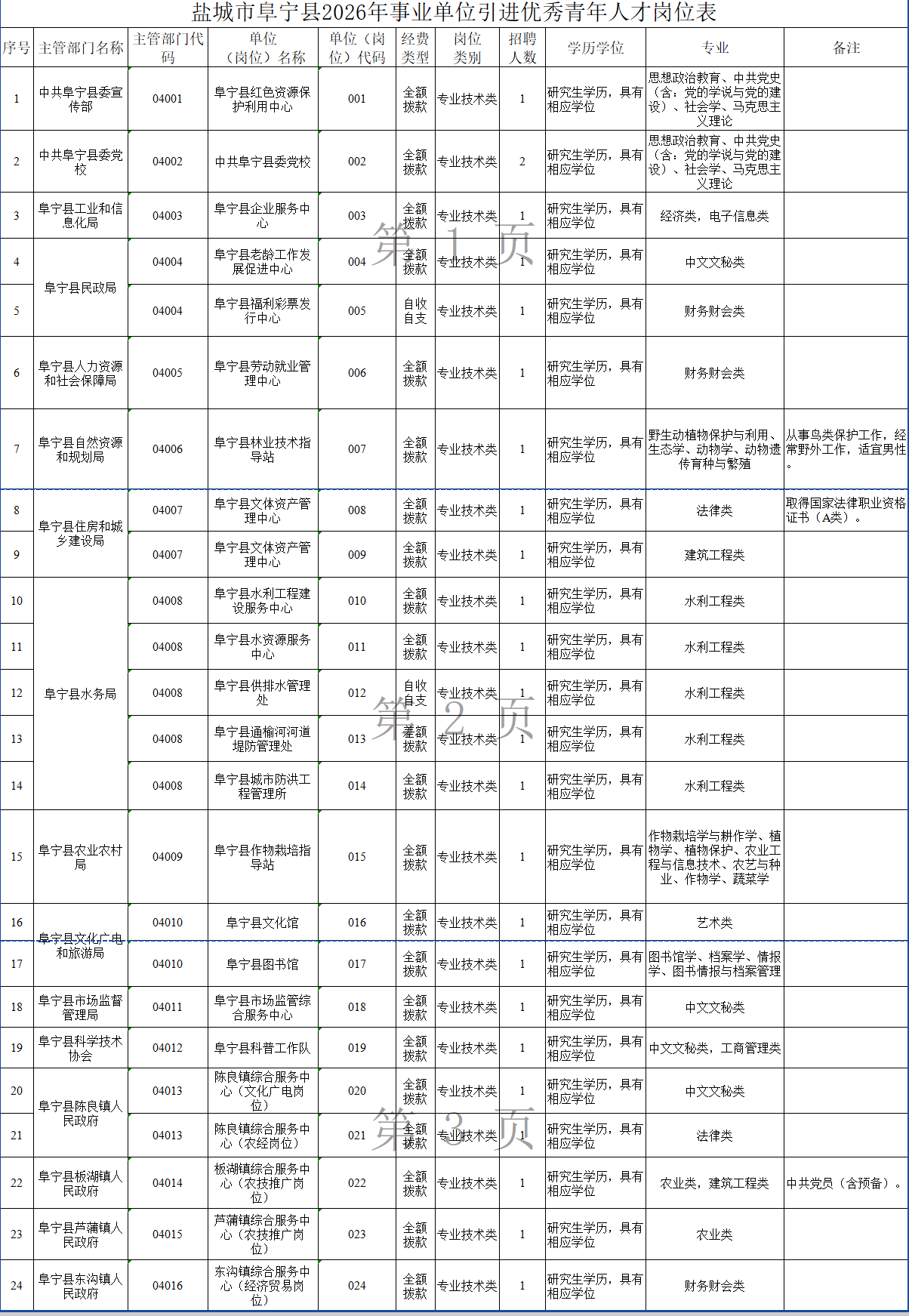 附件1:江苏省盐城市2026年事业单位招聘优秀青年人才岗位表